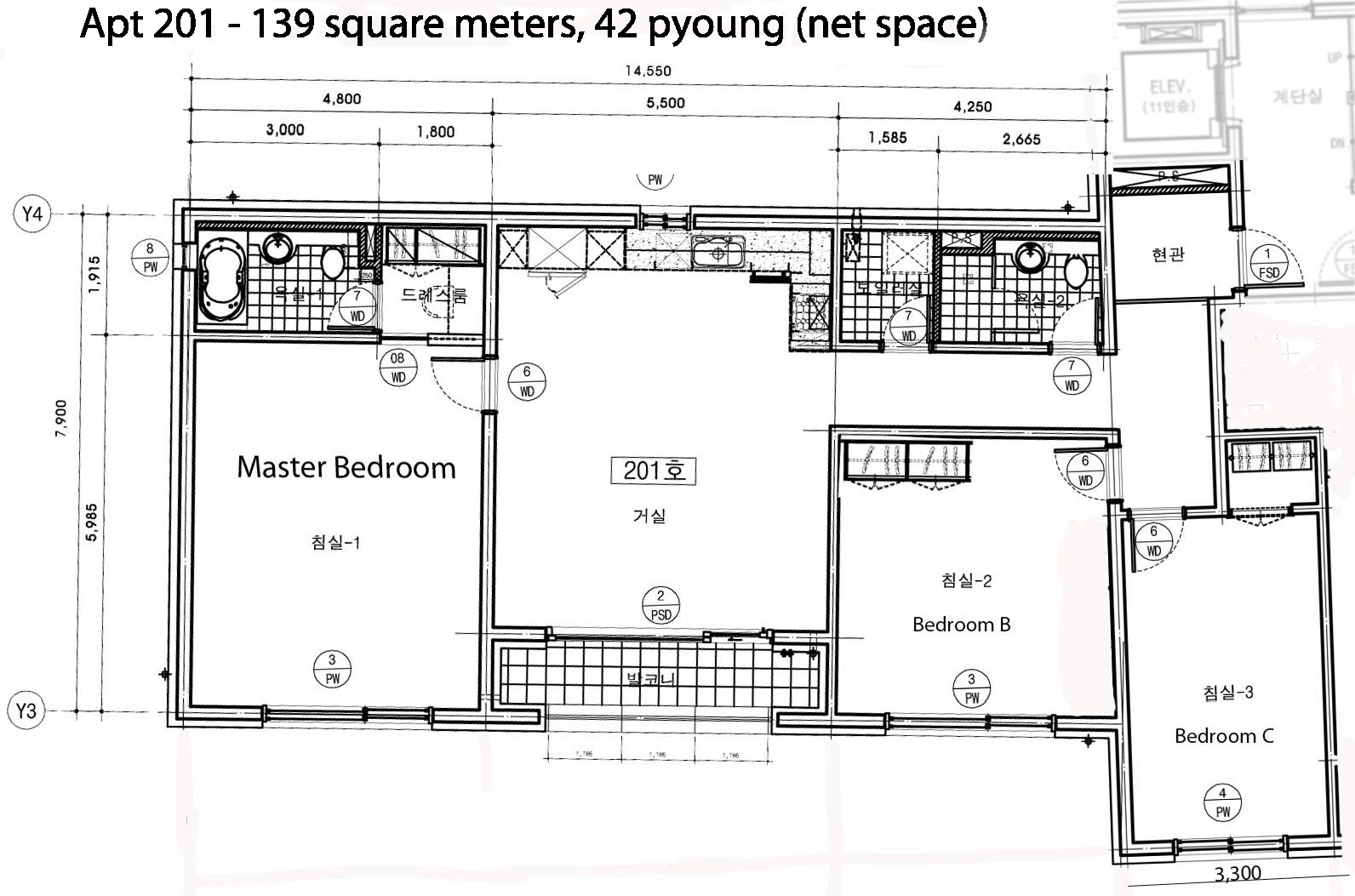 This apartment is approximately 139 square meters or 42 평 (pyeong) in net living space, not including the veranda. It features three oversized bedrooms, two bathrooms, spacious living room and dining areas and a 5m² veranda.
