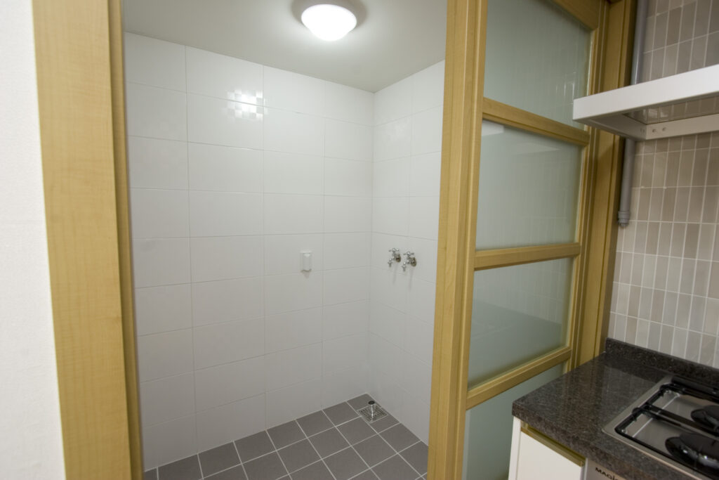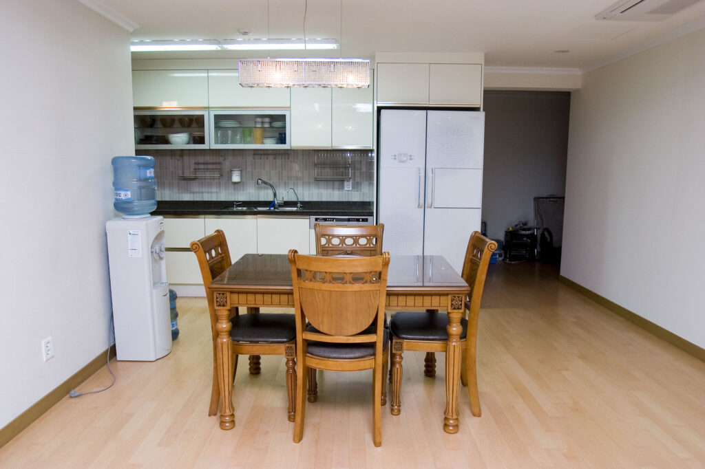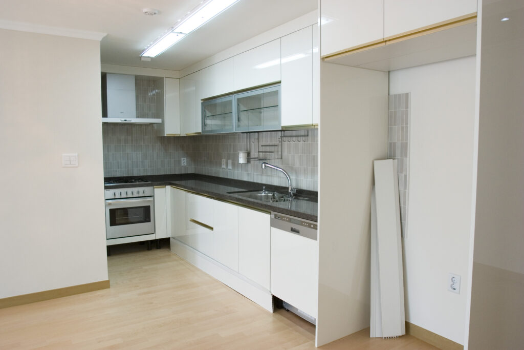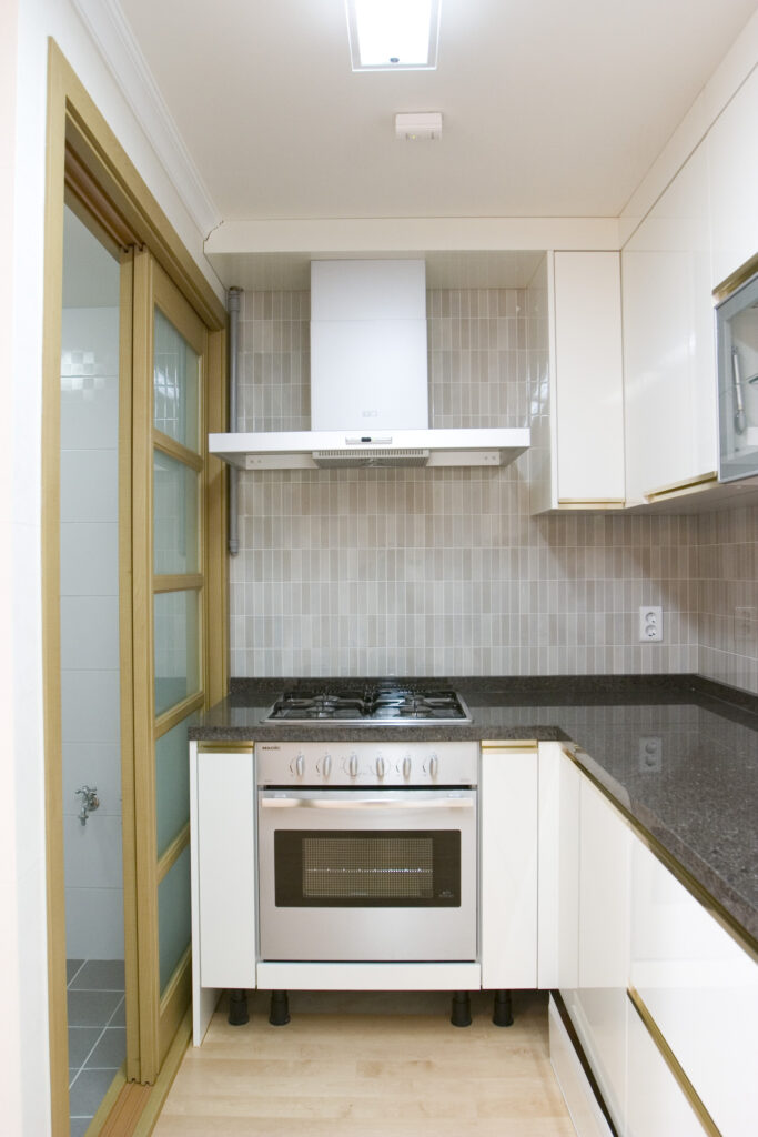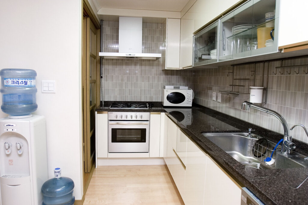 Hanssem kitchen with built in oven, cooktop, hood, large kitchen sink and