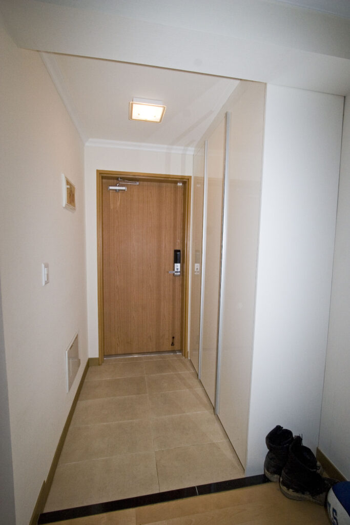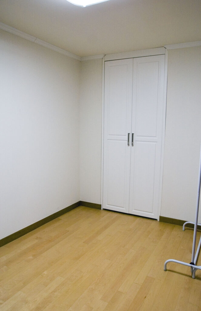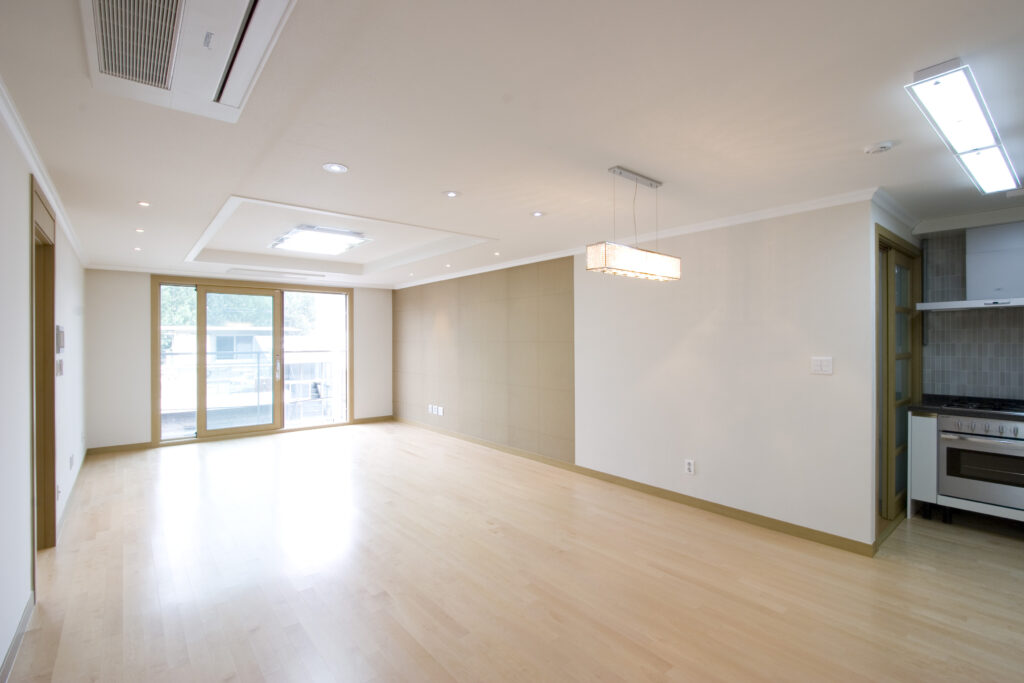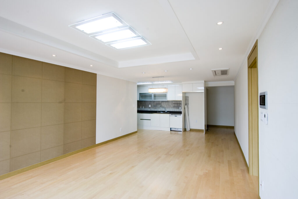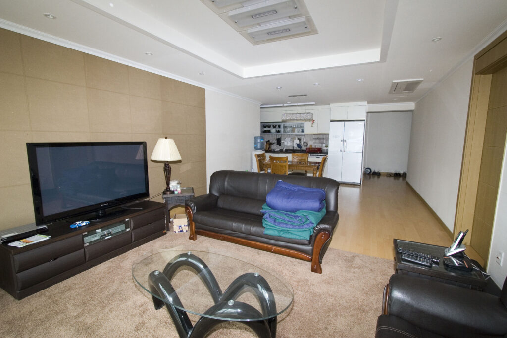 This apartment is approximately 103.7 square meters or 31.4 평 (pyeong) in net living space, not including the veranda. It features three bedrooms and two bathrooms, a spacious living room and dining area, a juliet balcony and a very large balcony measuring almost 14m², and ample natural light.