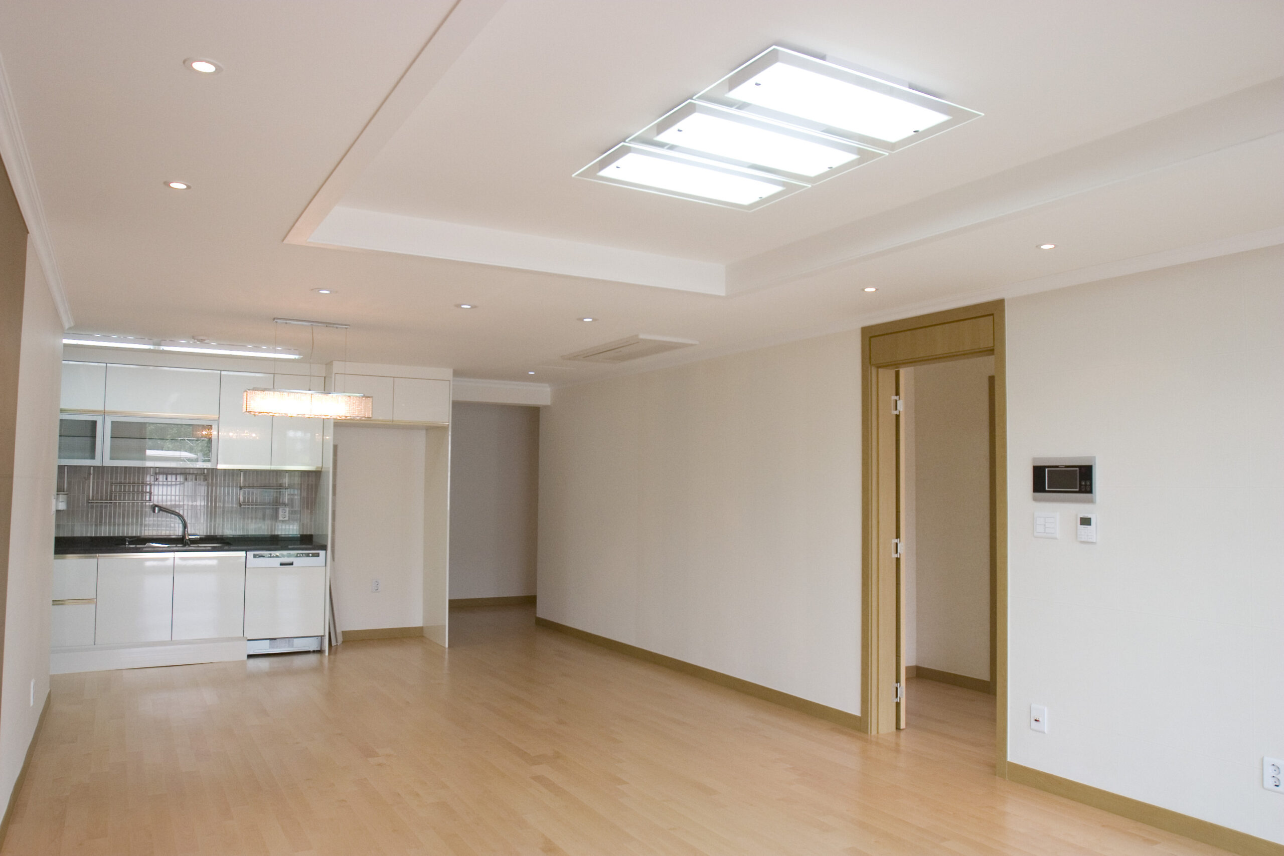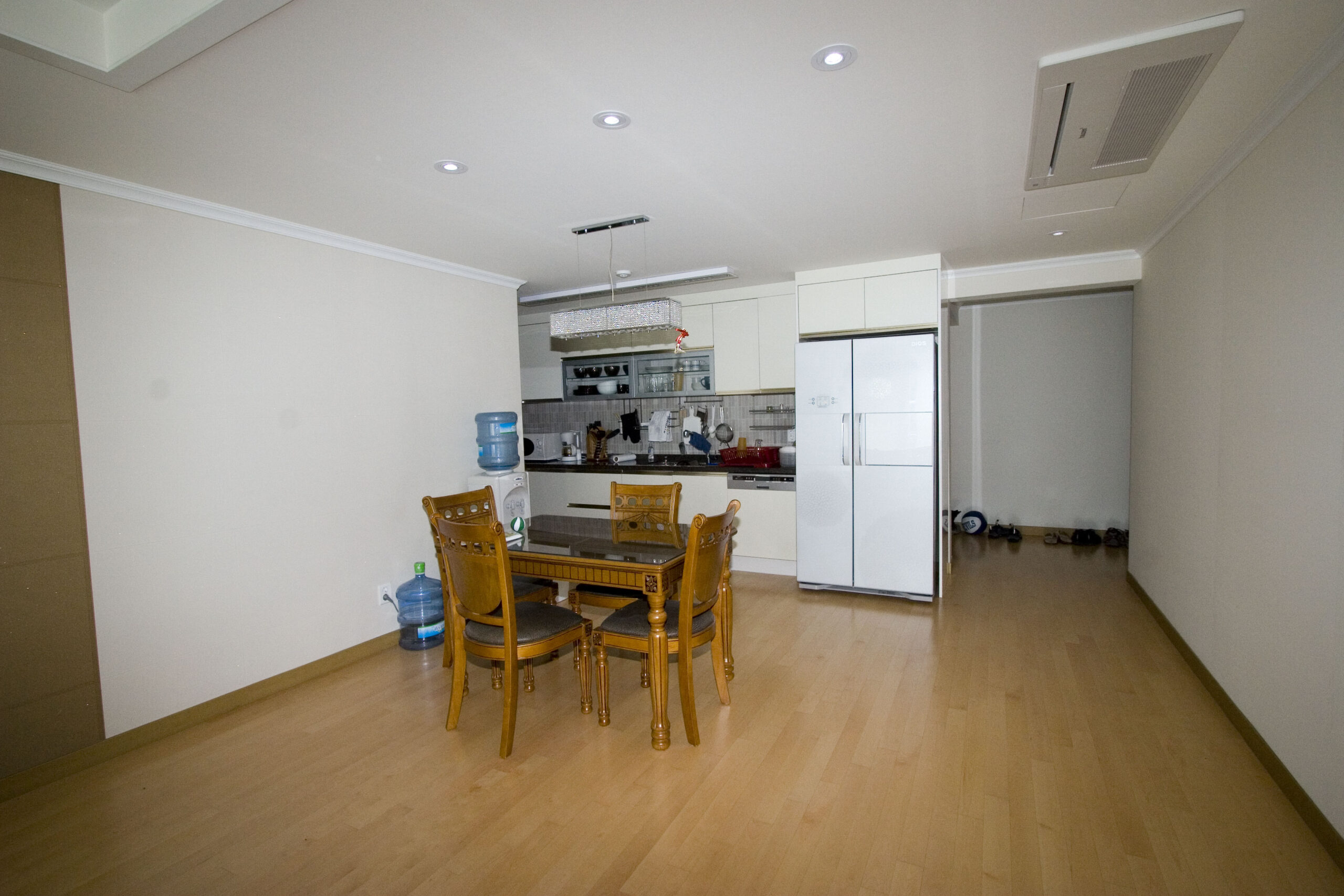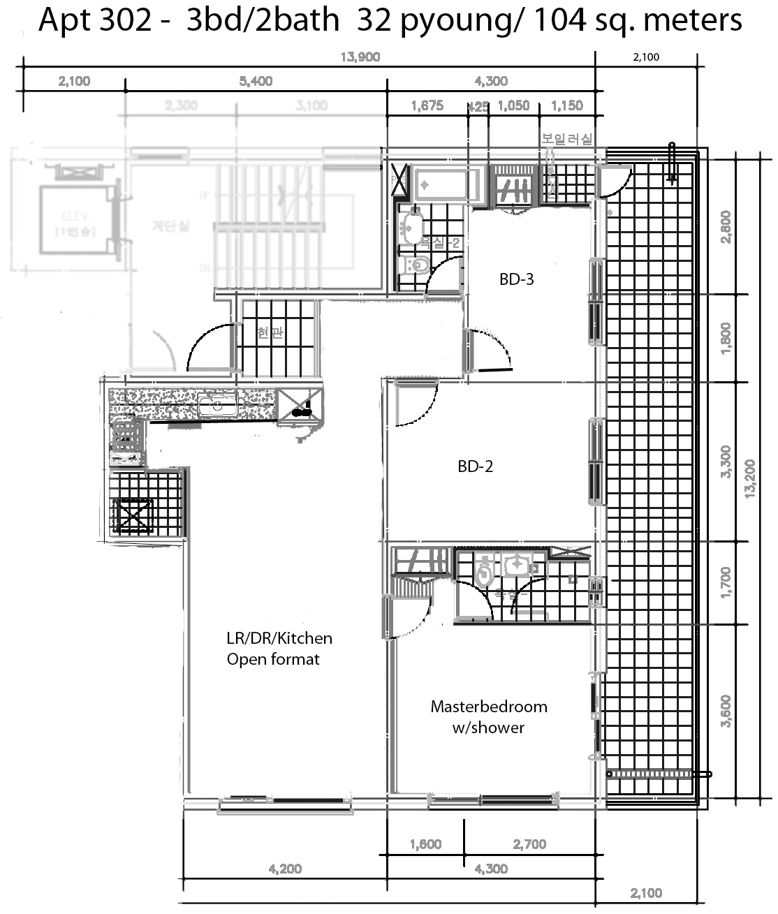 This apartment is approximately 103.7 square meters or 31.4 평 (pyeong) in net living space, not including the veranda. It features three bedrooms and two bathrooms, a spacious living room and dining area, a juliet balcony and a very large balcony measuring almost 14m², and ample natural light.