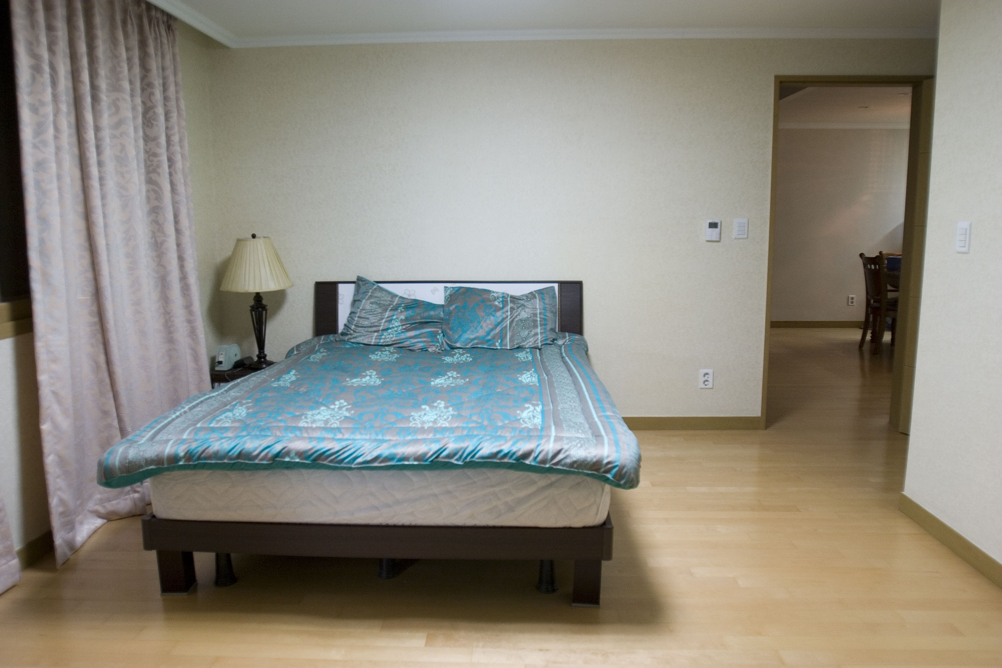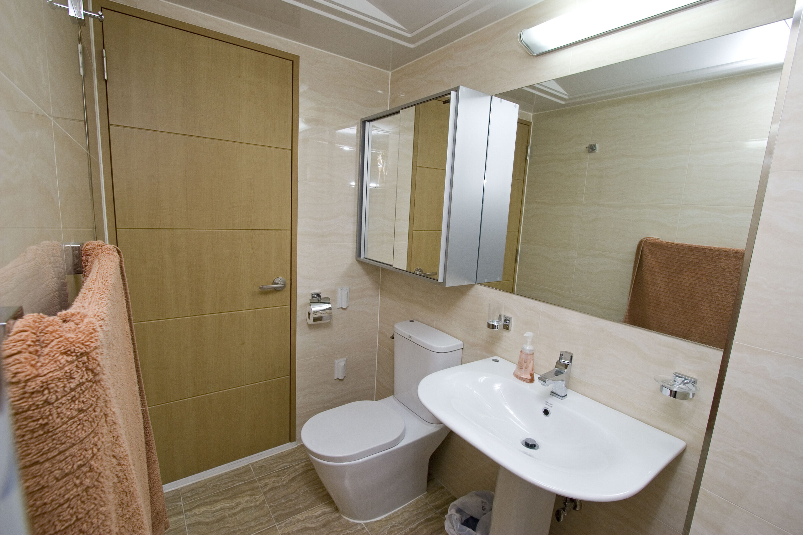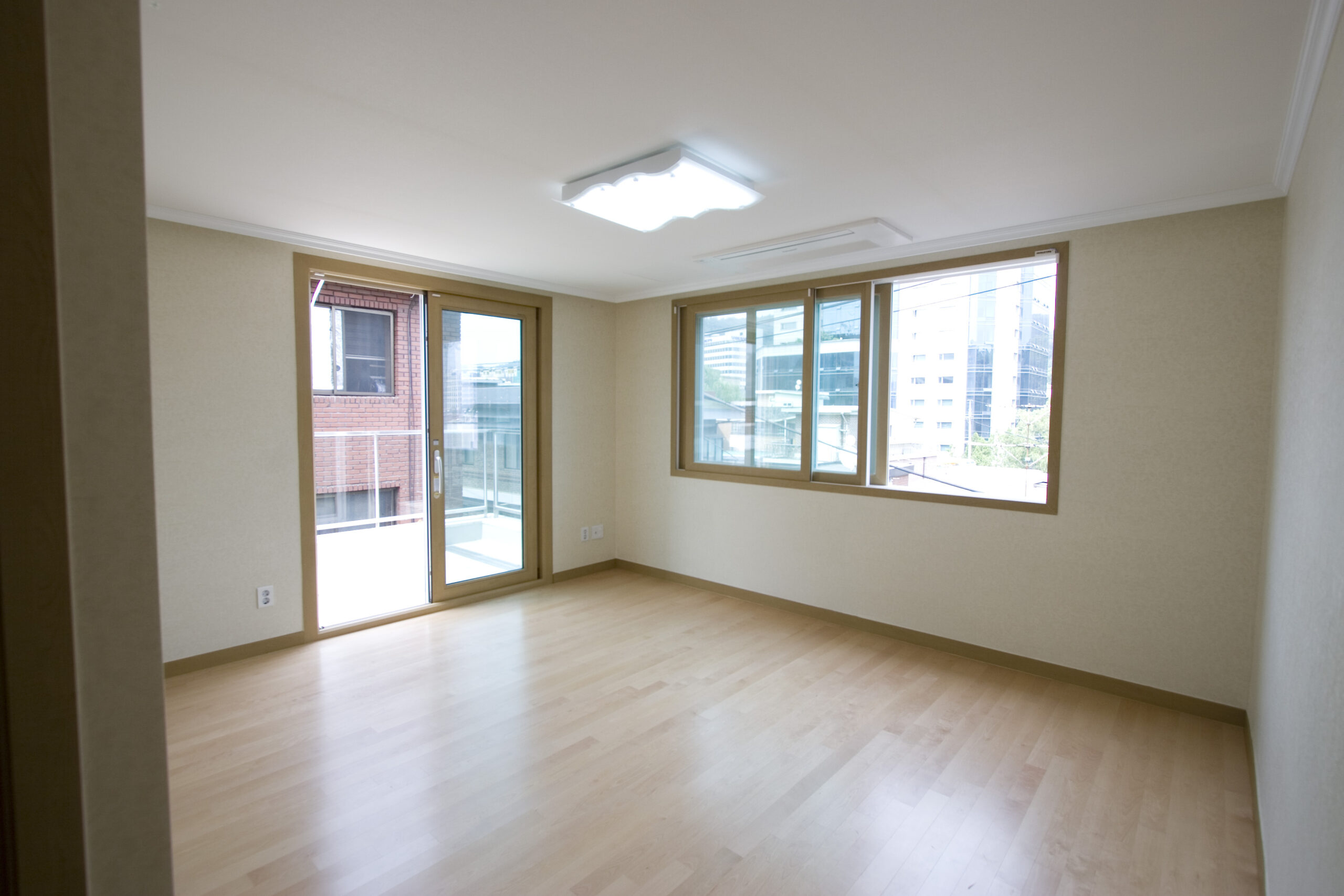 This apartment is approximately 103.7 square meters or 31.4 평 (pyeong) in net living space, not including the veranda. It features three bedrooms and two bathrooms, a spacious living room and dining area, a juliet balcony and a very large balcony measuring almost 14m², and ample natural light.