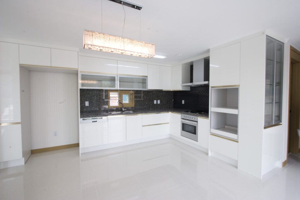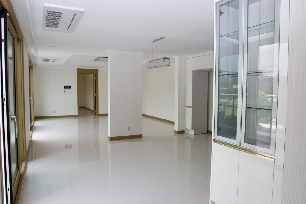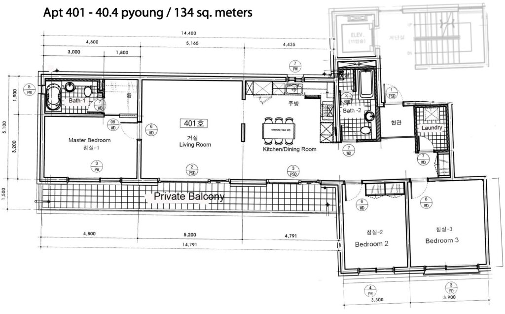 This apartment is approximately 133.6 square meters or 40.4 평 (pyeong) in net living space, not including its 16m² balcony. It features three large bedrooms and two baths, one with a whirlpool, lots of natural light in the living room, a terrific view, mood-lit living room, faux marble floors in the kitchen, dining and living rooms, and wood floors in the bedrooms.
